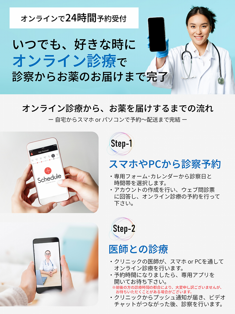 ①オンライン診療の公式CLINICSアプリに登録・診察予約をします。②CLINICSアプリから、予約時間になったら入室し、診察を受けます。(※前後の診察時間により、お待ちいただくことがあります)③医師が患者様の状況と症状などを診断しながらお薬を処方します。④オンライン診察後、料金決済確認し、翌日発送によりお薬をお受け取りいただけます。